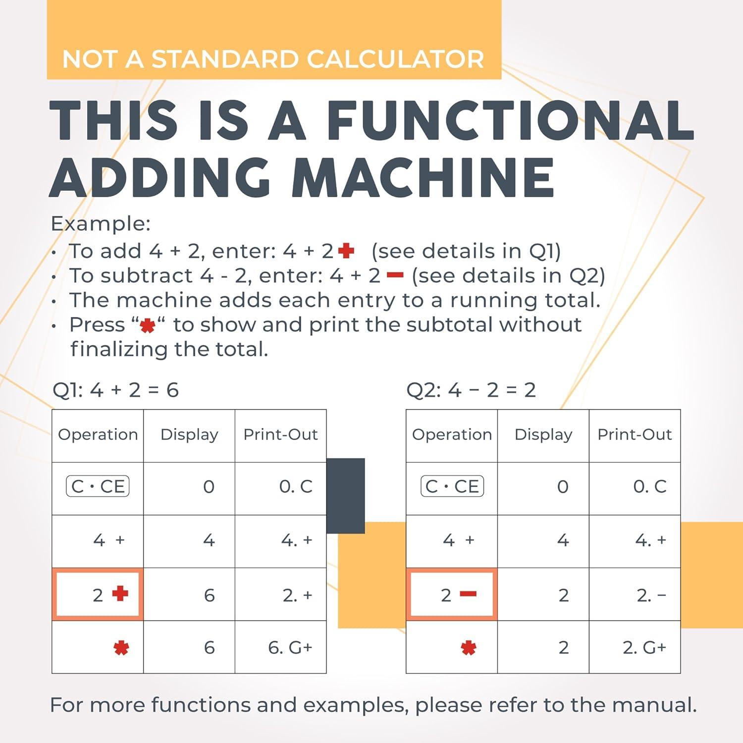 [IMPORTANT!] – This is an adding machine and DOES NOT function like a standard desktop calculator. For example, to do the equation 4 – 2, you would need to press “4” then “+” then “2” then “-” then “equals” to get the right answer. Tutorials and examples are provided in the detailed instruction manual.