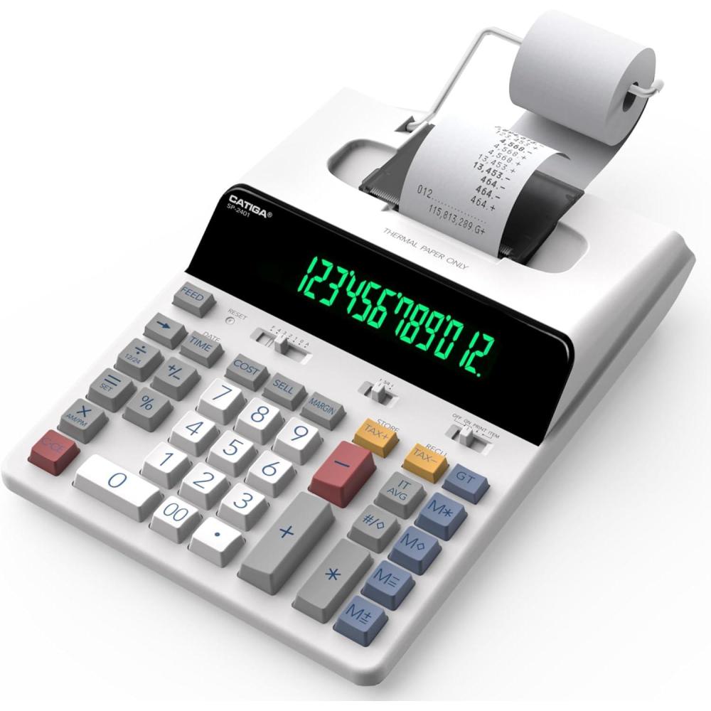 imageCATIGA 12 Digit Thermal Printing Calculator with Tape Print Out InkFree Adding Machine 5X Faster Quite at 80 LPS Extra Large Fluorescent Display Tax Calculation with Clock and Calendar SP2401Black